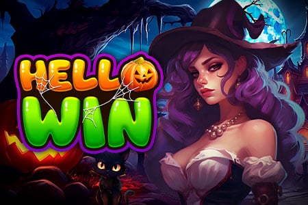 A festive game with bright, cheerful graphics showcasing a witch and Halloween elements like pumpkins and cobwebs, focused on winning through fun, spooky themes, and colorful symbols.