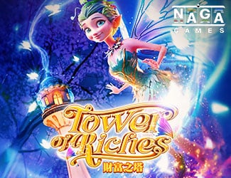 A fantasy-themed game with a whimsical fairy character in front of a glowing tower, focusing on magical treasures and mystical wins within a vibrant, enchanted setting.